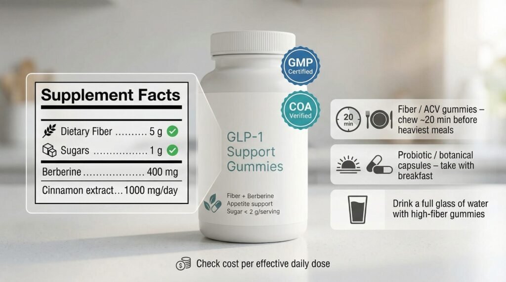 Timing is simple: chew fiber or ACV gummies 20 minutes before your heaviest meals; take probiotic or botanical capsules with breakfast for steady blood levels. Drink a full glass of water with any high-fiber product to prevent bloating.