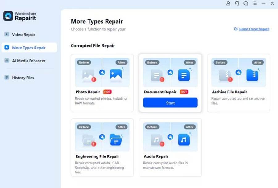 Open the program and opt for “More Types Repair”, then select “Document Repair.” Afterward, press the “Start” button to add the damaged Word files.