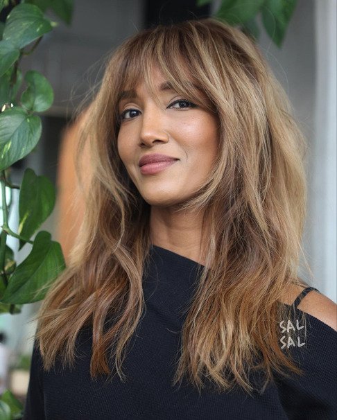 Incorporating layered bangs is the perfect way to sample a layered look without losing length. They provide soft face-framing texture and movement without commitment. Bangs effortlessly blend shorter top layers with longer base layers.