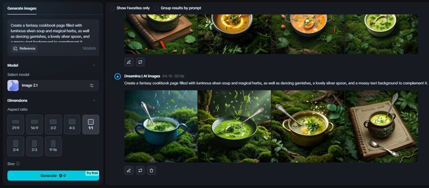 Using Dreamina’s image generator, you can create each dish as lush or creepy-looking as you prefer. Experiment with prompts like: “A fantasy cookbook page filled with luminous elven soup and magical herbs, along with dancing garnishes, a lovely silver spoon, and a mossy-textured background to complement it.
