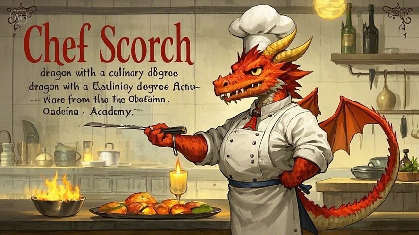 • Creature chef bios: Include portraits and bios of made-up chefs, maybe Chef Scorch, a dragon with a culinary degree from the Obsidian Academy.